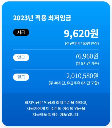 2022년 대비 2023년의 최저시급은 5.1% 인상된 9,620원입니다. 그에 따라 최저임금도 200만 원을 넘게 되었습니다.