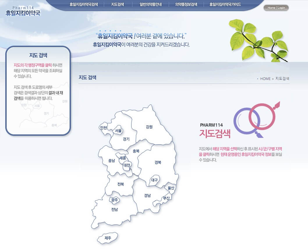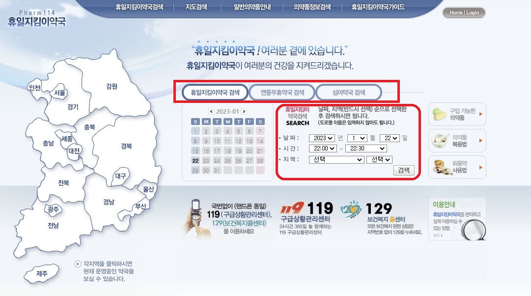 2. 홈페이지 휴일지킴이/연중무휴/심야 약국 중 선택