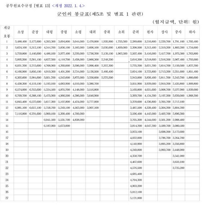 부사관 하사 기준 170만 원에서 약 173만 원 정도 인상.장교 소위 기준 175만 원에서 약 178만 원 정도 인상.