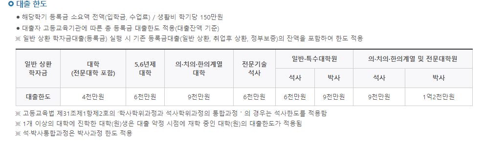 - 대출한도 : 대학 4천만 원 ~ 의대 박사과정 최대 1억 2천만 원까지